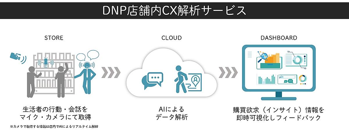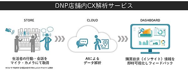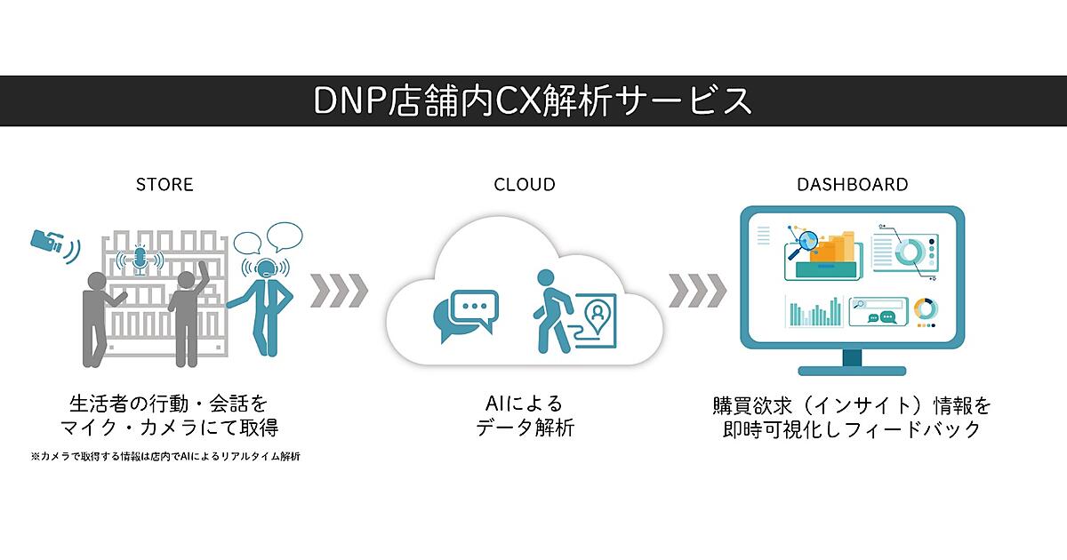 大日本印刷(DNP)は、店舗に設置したマイクとカメラのセンシング機器で接客時の会話と来店客の行動のデータを取得して、生活者の潜在的な購買欲求(インサイト)を解析・可視化する「DNP店舗内CX(顧客体験)解析サービス」のトライアル提供を5月18日から始める、と同日発表した。流通・小売企業やメーカー向けトライアルで、2022年に本サービスとして提供し、2023年度までに関連サービスを含めて約20億円の売上を目指す。