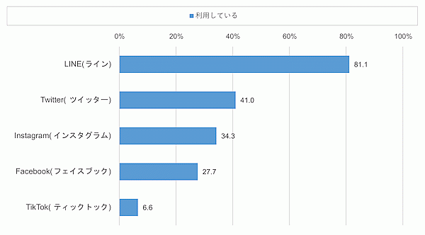 まず、LINE、Twitter、Facebook、Instagram、TikTokという代表的なSNSについて、利用率(月に1回以上利用)を聞くと、最多は「LINE」81.1%で他と大きく差を付けた。2位以下は「Twitter」41.0%、「Instagram」34.3%、「Facebook」27.7%、「TikTok」6.6%の順だった。