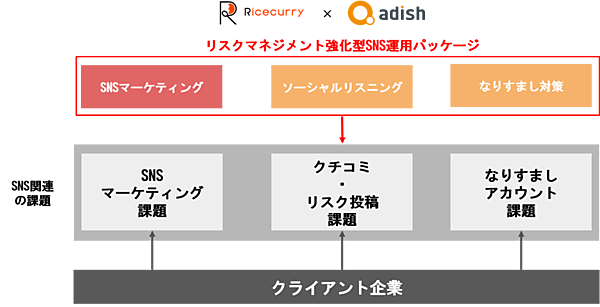 コミュニティに関する各種サービス事業を展開するライスカレーは、「リスクマネジメント強化型SNS運用パッケージ」の提供を始める、と5月25日発表した。ソーシャルメディアで増加する偽アカウントや不適切なコメントを監視する。ソーシャルメディアの投稿をモニタリングするソーシャルリスニングサービスを手掛けるアディッシュと連携する。
