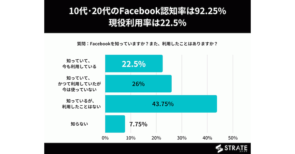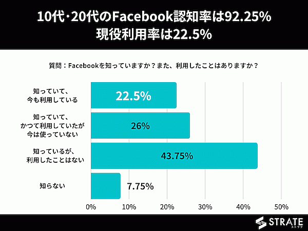 まず「Facebookを知っているか?」、また「利用したことはあるか?」を聞くと、現在の利用者(今も利用している)は22.50%。利用経験者(今も利用している+今は使っていない)は48.50%、認知している人(今も利用している+今は使っていない+知っているが使ったことはない)は92.25%だった。「知っているが利用したことはない」という10代・20代が主流を占めた。