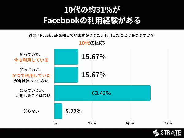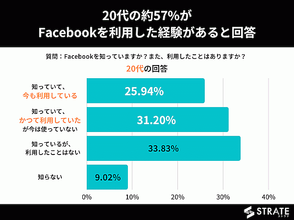 一方20代に限ると、現在の利用者(今も利用している)は25.94%。利用経験者(今も利用している+今は使っていない)は57.14%だった。Facebookの認知自体は、どちらの世代も9割を超えるが、10代は「そもそも使ったことがない」、20代は「使ったことはあるが、使わなくなった」という人が多いようだ。