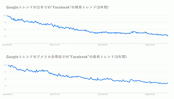 なお日本とアメリカにおける、Googleトレンドでの「Facebook」の検索推移を見ると、2016年以降は徐々に下降している。