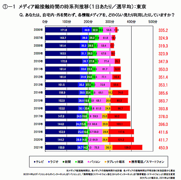 それによると、テレビ、ラジオ、新聞、雑誌、パソコン、タブレット端末、携帯電話/スマートフォンといった「メディア総接触時間(1日あたり/週平均)」が、2020年の411.7分から大幅な伸びを見せ、7.5時間超となる450.9分に到達した。伸び率・総接触時間ともに過去最高を記録しており、コロナ禍による巣ごもり需要などが寄与したと考えられる。