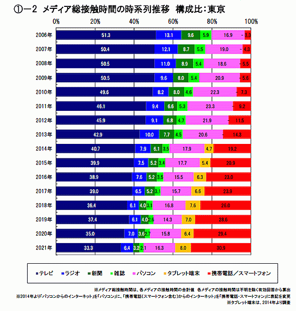 機器別で見ると、「携帯電話/スマートフォン」 (昨年から18.0分増)を始めとして、「タブレット端末」(同9.7分増)、「パソコン」(同8.4分増)が増加し、視聴シェアを大きく伸ばした。一方「テレビ」の接触時間も5.8分増加している。