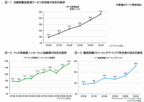 「定額制動画配信サービス」の利用率は、2020年から9.7ポイント上昇して46.6%。コロナ禍前から伸びていたが、急成長を維持している。インターネット動画をテレビで視聴できる「ストリーミングデバイス」の普及率も、9.0ポイント増の25.5%に達している。