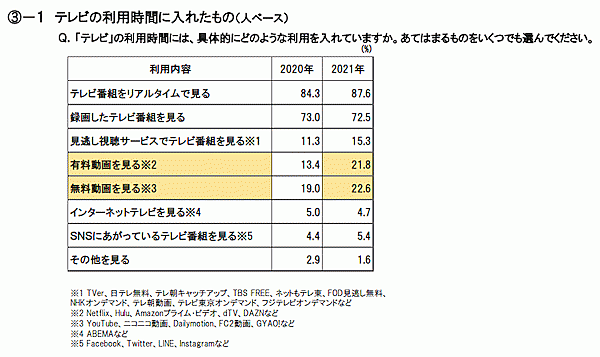 視聴者は、テレビ放送とネット動画の区別があいまいになっており、「テレビの利用時間」を聞く質問に対して、「有料動画」「無料動画」などを回答するようになっている。