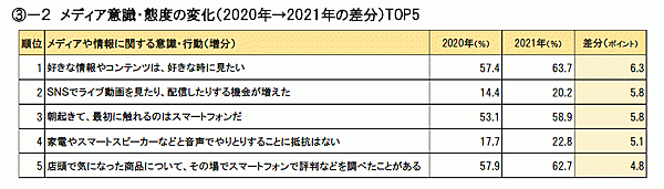 メディア意識・態度の変化では、「好きな情報やコンテンツは、好きなときに見たい」がもっとも変化し、昨年から6.3ポイント増加して6割を超えた。