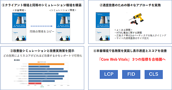 表示速度改善サービスは、まず対象サイトのコピー環境を構築し、Core Web Vitalsや、同じGoogleのページ速度計測ツール「PageSpeed Insights」に基づく現状のスコアを測定。コピー環境でHTMLやJavaScriptの改修、3rdパーティタグの最適化といった施策を施してスコア改善の検証を繰り返すことで、効果が最も高い施策案を導き出す。その施策を基に実行、検証、改善を支援する。