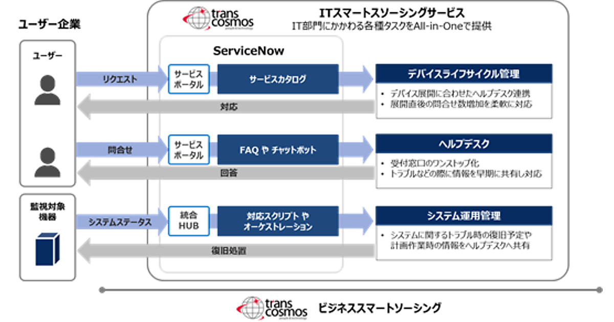 トランスコスモスが提供してきた300社以上のIT運用管理の知見と、ServiceNowのプラットフォームを組み合わせ、ITに関するプロセス全体を「ITスマートソーシングサービス」としてサービス戦略からオペレーションまで提供する。顧客企業のITタスクを上流から下流まで一元化して提供することで、3年で約30%のコスト削減が可能になる。