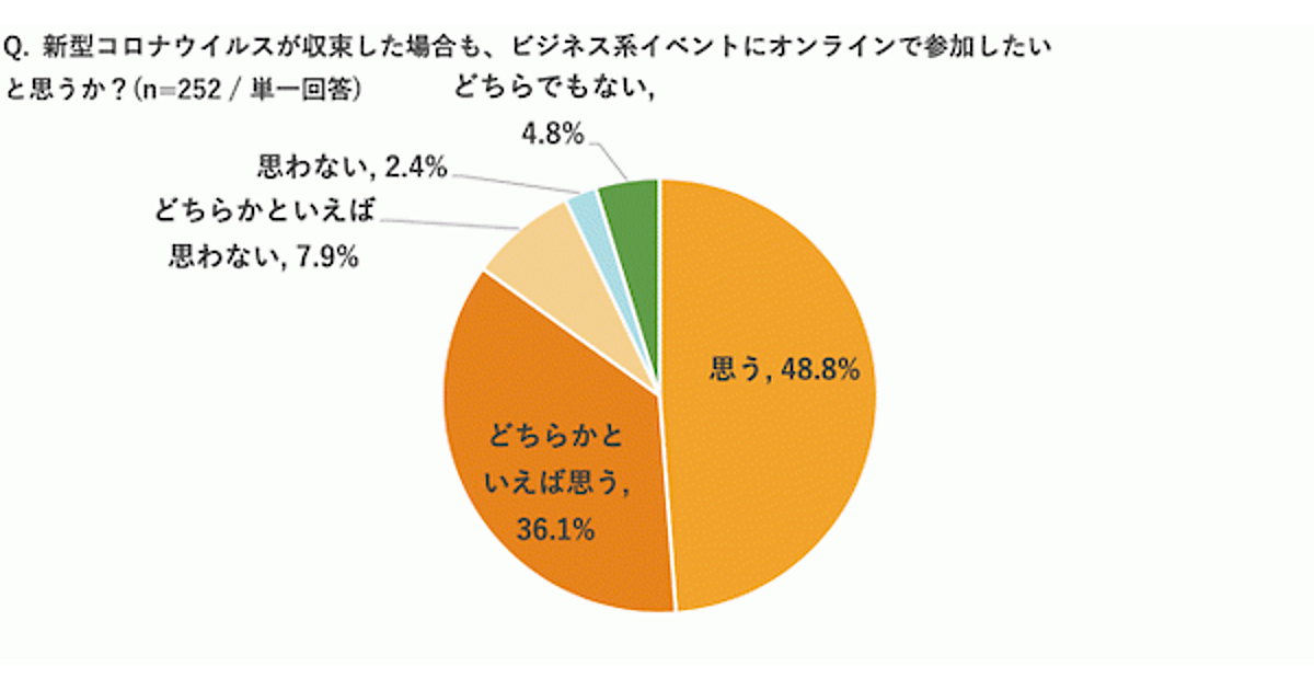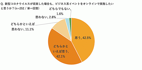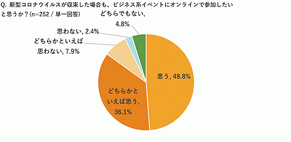 また参加意向についても、84.9%が「コロナ収束後においても、ビジネス系イベントにオンラインで参加したい」としており、今後定着していくと考えられる。