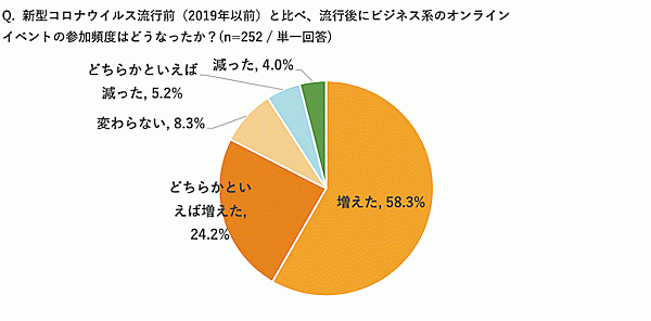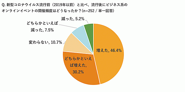 次にイベント参加者側に、「新型コロナ流行後に、ビジネス系オンラインイベントの参加頻度がどう変わったか」を聞くと、「増えた」「どちらかといえば増えた」の合計は82.5%。イベントそのものがそもそもオンラインしかなかったというケースもあるため、これは当然の結果と言える。