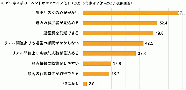まずイベント運営者側に、「ビジネス系オンラインイベントの開催頻度の変化」を聞くと、コロナ前に比べて頻度が増えたのは76.6%だった。「ビジネス系イベントをオンライン化して良かった点」では、「感染リスクの心配がない」67.1%、「遠方の参加者が見込める」52.4%、「運営費が削減できる」49.6%が上位だった。