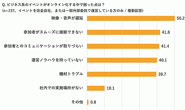 一方「ビジネス系イベントをオンライン化する中で困った点」では、「映像・音声が遅延」50.2%、「参加者がスムーズに接続できない」41.8%といった技術面のトラブルとほぼ並んで、「参加者とのコミュニケーションが取りづらい」41.4%があがっている。