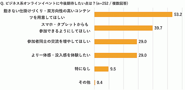 イベント運営者側同様に、イベント参加者側にも「オンライン化で良かった点」「今後期待する点」を聞くと、良かった点では「移動時間を削減できる」76.6%、「交通費を節約できる」65.9%、「遠方のイベントにも参加できる」63.9%が上位だった。「今後期待する点」では、「飽きない仕掛けづくり・双方向性の高いコンテンツを用意してほしい」53.2%、「スマホ・タブレットからも参加できるようにしてほしい」39.7%、「参加者同士の交流を増やしてほしい」29.0%だった。
