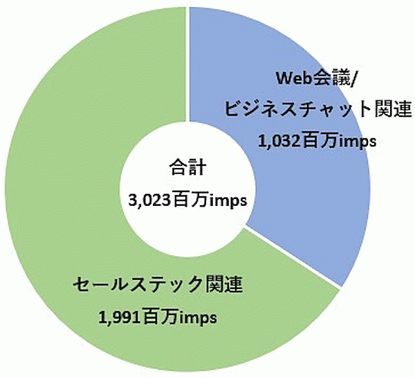 まず、「Zoom」「Microsoft Teams」「Slack」「Chatwork」といった、Web会議/ビジネスチャットなどの“コミュニケーション関連サービス”の出稿量は、推定で約10億インプレッションだった。「セールスフォース」「b→dash」「Sansan」など、MA・CRMツール・名刺管理といった“セールステック関連サービス”の出稿量は、ほぼその倍の推定約20億インプレッション。なお、両者が占める割合は、「IT関連」カテゴリ全体の0.5%となっている。