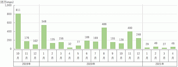 “コミュニケーション関連サービス”について出稿量の推移をみると、緊急事態宣言が発出された2020年4月が特に多く、2020年度の総出稿量の約4割に達していた。