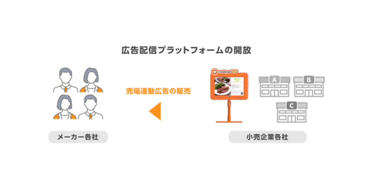 CookpadTVはメーカー広告の配信を運営してきたが、6月から広告配信プラットフォームを小売企業に開放。さらに独自の広告企画を小売企業主導で販売できる「ADpop」を提供する。小売企業は自社の商品販売計画やキャンペーンに合わせてstoreTVと売場が連動した広告商品を用意し、取引メーカーへ販売できる。広告企画のメーカーへの販売は全国の小売企業やメーカーと幅広いネットワークを持つ三菱食品と連携して行う。