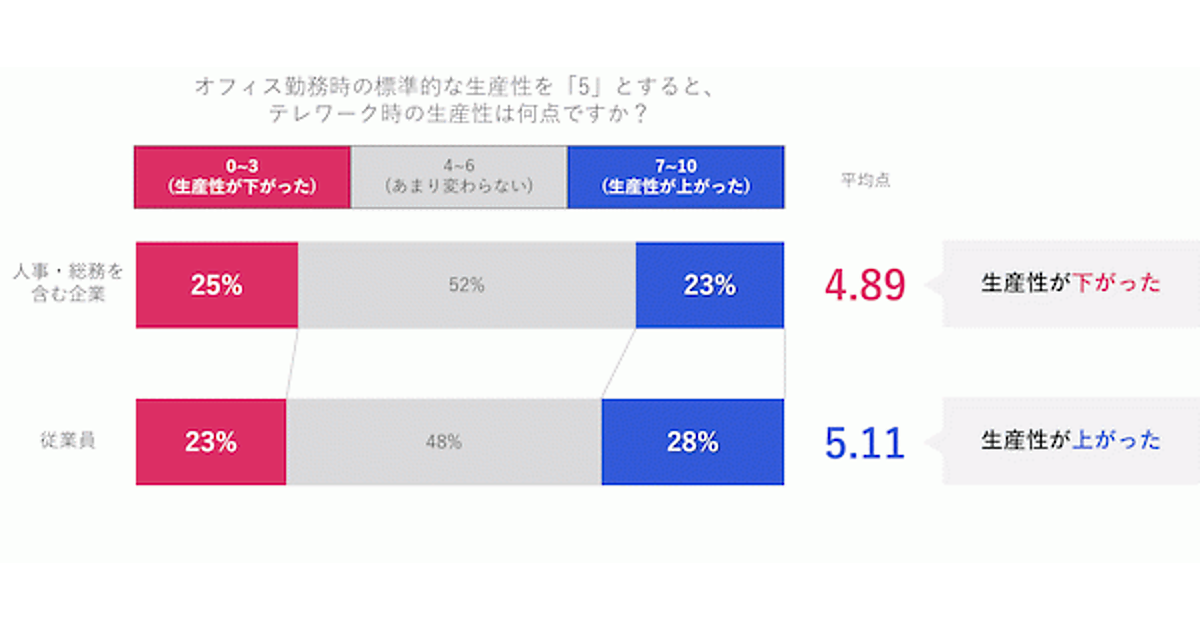 まずオフィス勤務時の標準的な生産性を「5」として、「テレワーク時の生産性」に点数を付けてもらったところ、人事・総務を含む企業側は、平均値が「4.89」でオフィス勤務時を下回ったが、従業員側の平均値は「5.11」とオフィス勤務時を上回っていた。テレワークで従業員は「生産性が高まった」、企業側は「生産性が下がった」と真逆に認識していたこととなる。