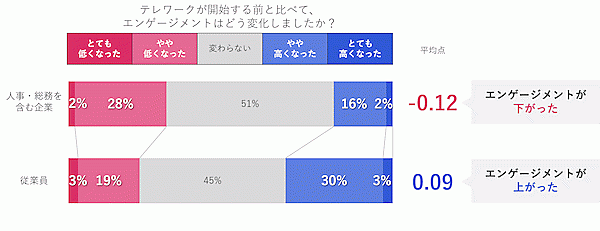 また「テレワークの開始前・後で、職場へのエンゲージメントがどう変化したか」を、従業員側と人事・総務を含む企業側に聞くと、従業員側は「エンゲージメントが高くなった」と回答した割合が合計33%で「低くなった」22%を上回ったが、企業側は「エンゲージメントが高くなった」は18%で、「低くなった」22%を下回るなど、これも逆の傾向が見られた。