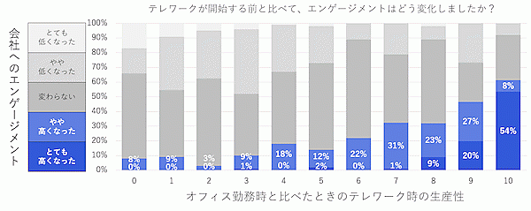 そして「テレワーク時の生産性の変化」と「会社へのエンゲージメントの変化」を軸にして見ると、「テレワークにより生産性が上がった」と回答している従業員ほど、「テレワーク開始によりエンゲージメントが高まった」と回答している傾向があった。