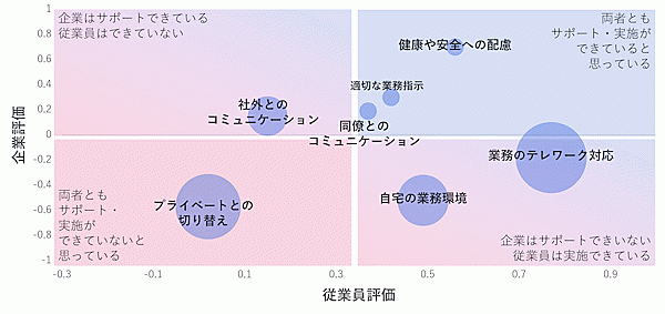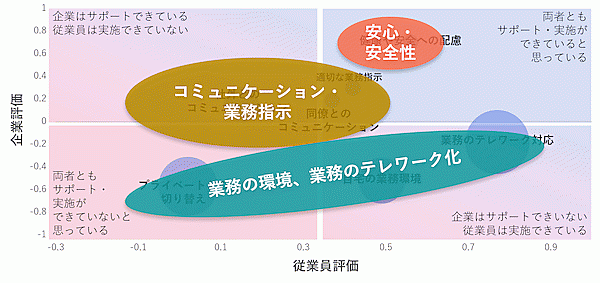 Emotion Techではこれらの要因を整理し、従業員側ビジネスパーソンと人事・総務を含む企業側ビジネスパーソンの認識ギャップについて、「コミュニケーション・業務指示」「安心・安全性」「業務の環境、業務のテレワーク化」の3つにグルーピングしている。