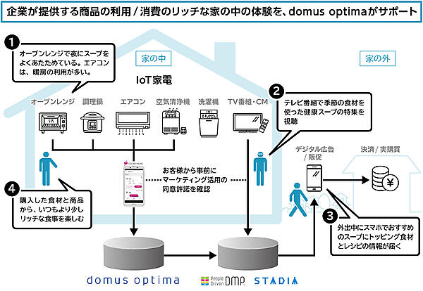 domus optimaは"快適な家"の意味。生活者の潜在的な需要をIoT家電データから発見し、新たな顧客体験を創出することを目的にする。IoT家電の普及が見込まれることからデータを利用することにした。β版ソリューションの第1弾は、エアコン、空気清浄機、オーブンレンジ、自動調理鍋、洗濯機といったIoT家電のデータを使う。