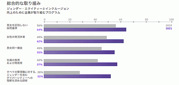 それによると、前回調査(2019年)と比較して、ジェンダー・フリーの採用選考や女性の育児休業など「ジェンダー・エクイティー」「ジェンダー・インクルージョン」の向上を図るためのプログラムを、多くの企業が拡大していた。具体的には「男女を区別しない採用基準」「女性の育児休暇」「男女同一賃金」といった項目が10ポイント前後増加している。