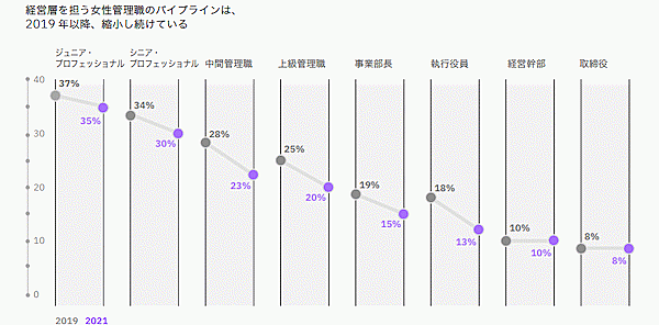 一方で、経営層を担う女性管理職のパイプラインは、2019年と比べほぼすべての役職で減少していた。