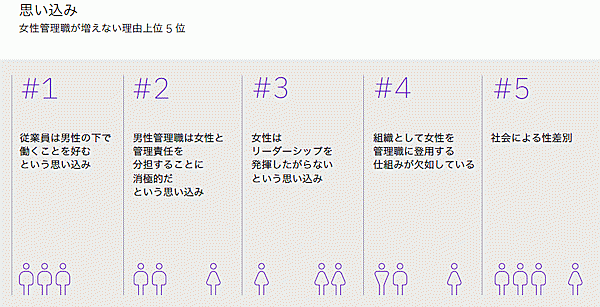 「女性管理職が増えない理由」としては、以下の5つが「思い込み」としてあげられている。男性は「従業員は男性の下で働くことを好む」、女性は「女性はリーダーシップを発揮したがらない」という思い込みが多いようだ。