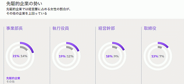 先駆的企業は必ず、「女性のキャリア・アップをビジネス上の最優先事項10項目の1つとして挙げている」「ジェンダー・インクルージョンを業績向上の原動力と考えている」「行動意欲が高く、ジェンダー・エクイティーを実現するために企業は変化し続ける必要があると考えている」という特徴があった。またそしてこうした先駆的企業では、経営層に占める女性の割合がその他企業を上回っている傾向が見られた。