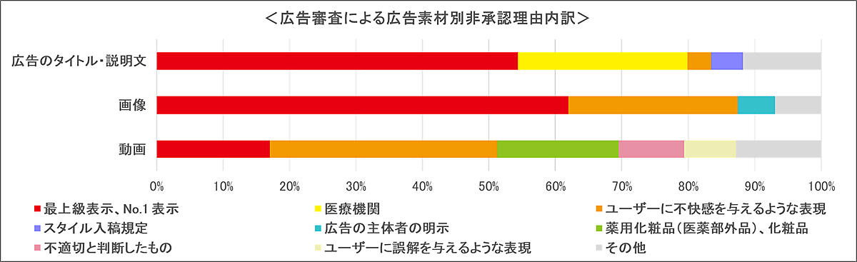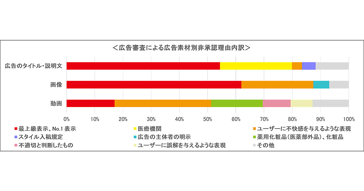 約1億7千万件の非承認は、Yahoo! JAPAN広告掲載基準、広告入稿規定、広告販売ルールに抵触した広告のタイトル、説明文、画像、リンク先のウェブサイト、キーワードなど各非承認数の合計となり、広告単体の件数とは異なる。最も多い非承認理由は「最上級表示、No.1表示」への抵触で、客観的に実証されていない優良誤認のおそれがある事例があった。