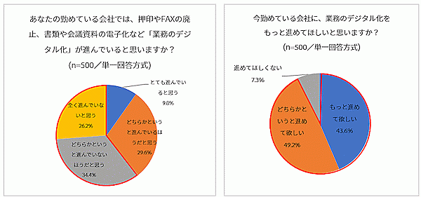 「業務をデジタル化することで業務効率が上がると思うか」については、「とても効率化される」35.8%、「どちらかというと効率化されると思う」46.2%で、8割超が肯定的に捉えていた。また、「今勤めている会社に、業務のデジタル化をもっと進めてほしいか?」を聞くと、「もっと進めてほしい」43.6%、「どちらかというと進めてほしい」49.2%で、9割超が推進を望んでいる。
