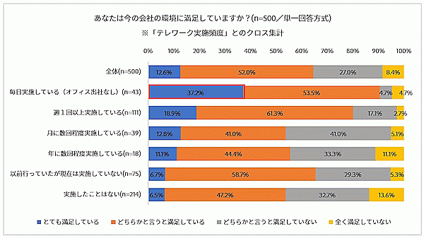 さらに「勤務する会社の環境に満足しているか」という設問について、テレワークの実施頻度ごとに分析すると、「毎日実施している(オフィス出社なし)」という企業では、「とても満足している」37.2%に対し「全く満足していない」4.7%と大差が付いており、「会社の環境にとても満足している」という回答が突出して多かった。これが「テレワークを実施していない」という企業では、「とても満足している」6.5%に対し「全く満足していない」13.6%と逆転していた。