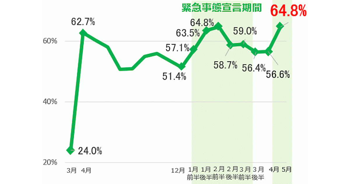 今回の調査によると、5月の都内企業のテレワーク実施率は64.8%だった。2021年2月以降、徐々に下降傾向を見せていたが、4月から大幅上昇し、過去最高の数値となっている。テレワークを実施した社員の割合で見ても、4月の49.8%から54.8%と、かなりの増加を見せている。