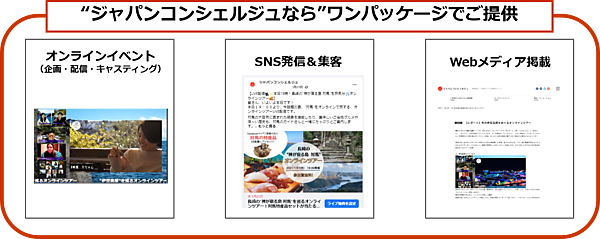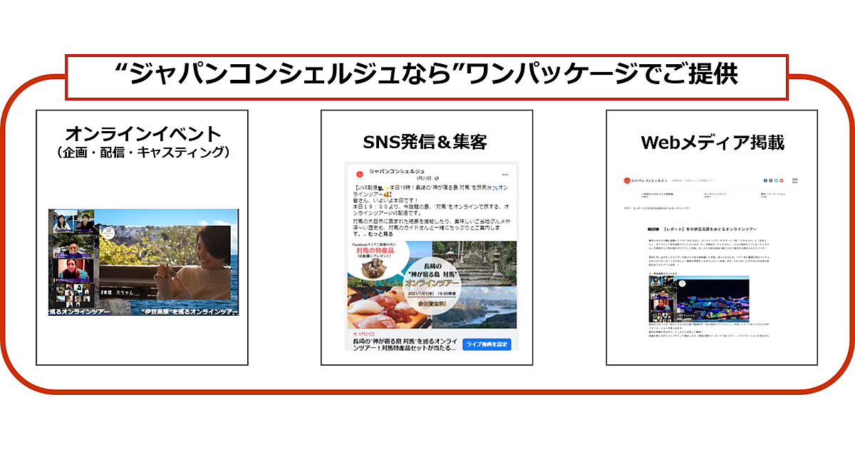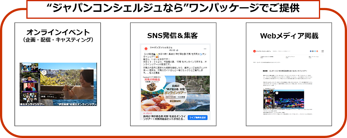家で楽しめる観光情報やオンライン体験でファンづくりを展開し、コロナ後に向けた戦略的な観光誘致で自治体や観光事業者を支援する。オンラインツアーではイベント企画・製作から「Facebook」「Instagram」「LINE」「YouTube」のSNSジャパンコンシェルジュと連動し、集客からライブ配信を通じた参加者との直接交流を展開する。現地体験のリアルさとエンタメ性にこだわった演出によって、「行ってみたい感」を醸成する。
