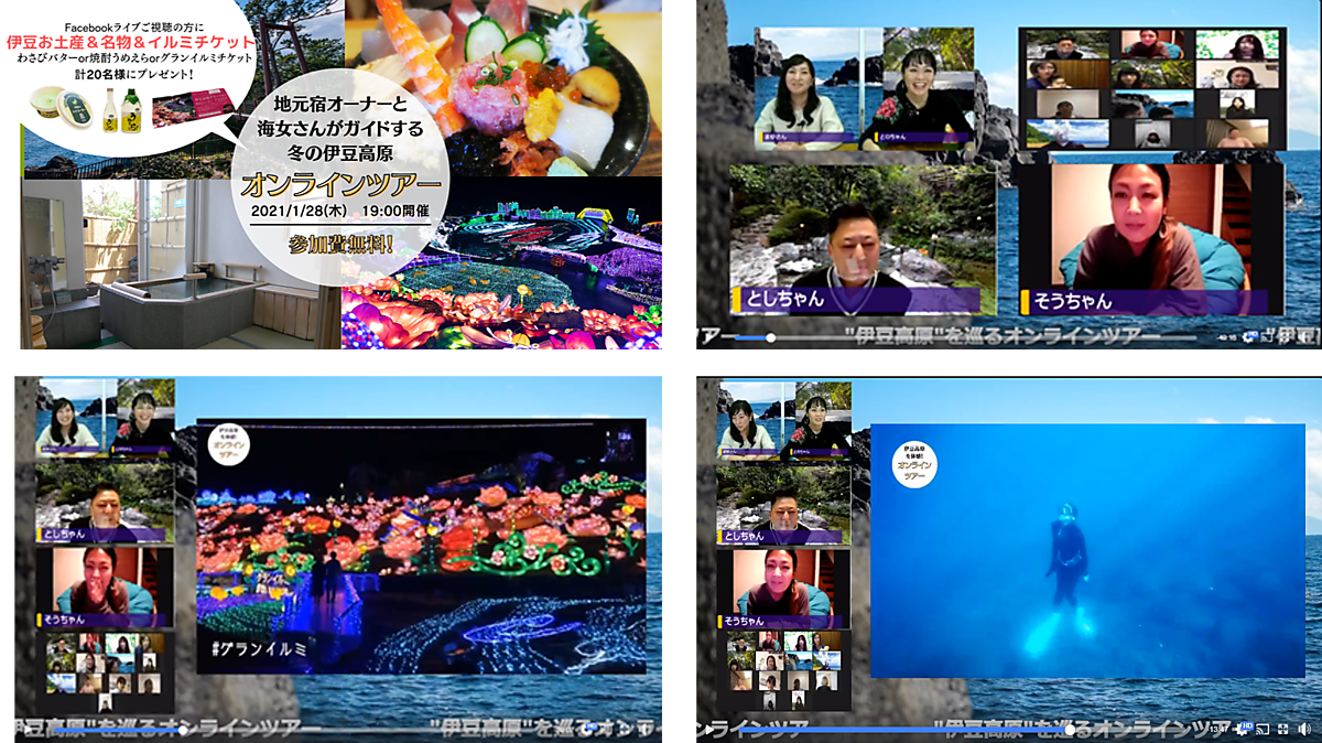 先行事例となった『冬こそ伊豆高原! オンラインツアー』は、1月の観光庁の公募事業(令和2年度補正予算)で「宿泊施設アドバイザー派遣事業」に採択された伊豆高原観光オフィスIKO(アイコ)と連携して公式SNSで実施。魅力的なコンテンツで多くの参加者が得られ、ツアー動画は2万回以上の再生回数だった。観光庁から今後の宿泊事業者の経営・事業推進策で「横展開が期待される取組」(10組)の1つに選出された実績がある。
