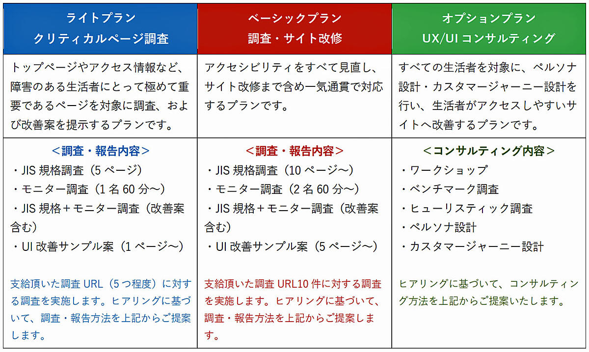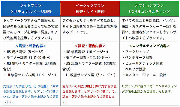 ユニバーサルデザインのリーティングカンパニーで多くの業務実績のあるミライロと、博報堂のグループ会社でWebサイトのUX(ユーザーエクスペリエンス)・UI(ユーザーインターフェース)開発専門の博報堂アイ・スタジオで企業サイトやアプリのWebアクセシビリティ改善・改修ソリューションをワンストップで提供する。博報堂SDGsプロジェクトの知見を生かして企業のSDGs課題全体を見据えたコンサルテーションも行う。