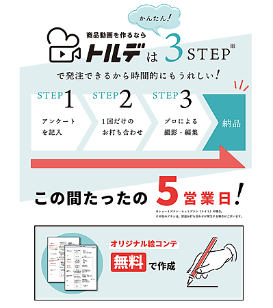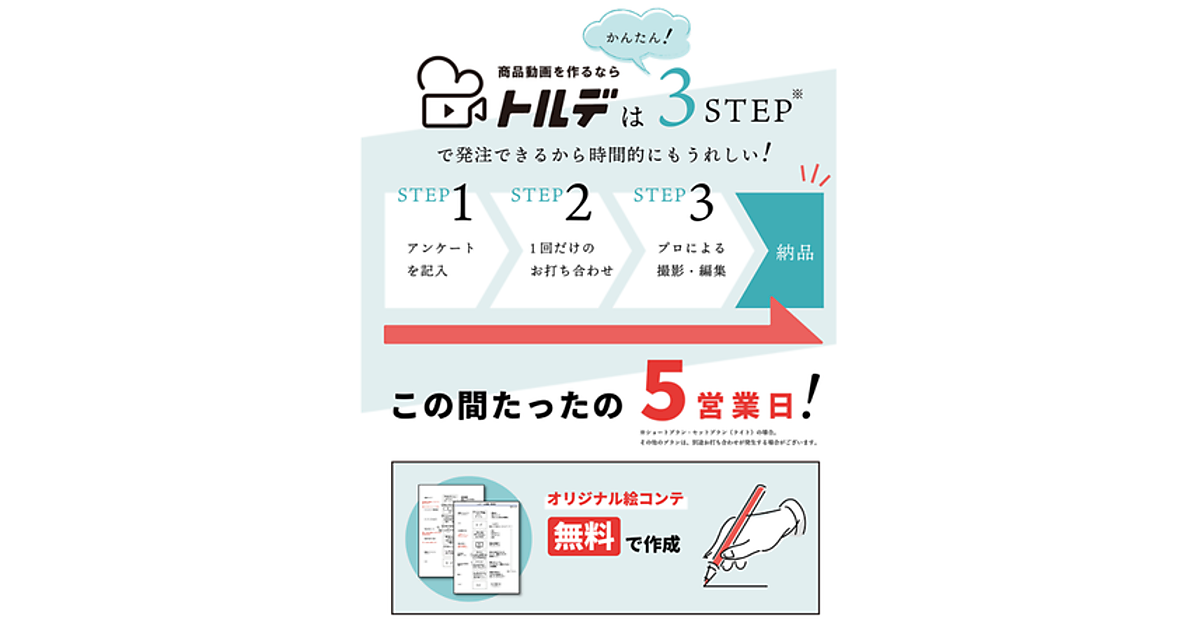 テレビCMなど映像企画・制作のワンダー・グラフィックスは、宣伝したい商品を送るだけで商品動画を制作する低価格動画制作サービス「トルデ」をリニューアルした、と6月16日に発表した。3つのクリエイティブイメージから気に入ったイメージを選択し、オリジナル絵コンテを元に1回だけオンラインで打ち合わせするだけで、プロによる撮影・編集を経て最短5営業日後に商品動画を納品する。