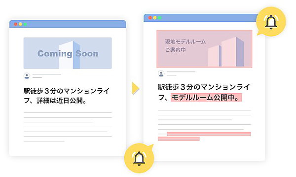 CERVNユーザーの「登録したページの配下のURLを全て自動で登録したい」「ログインが必要なページもモニタリングしたい」「今回と前回、前々回の状態を比較したい」などの要望に応えた。管理画面はプロジェクト単位で設定でき、さまざまな形式で表示するので差分の「あり」「なし」が一目瞭然で分かる。 競合サイトのプレスリリースやイベント情報、グローバル企業の各国法規や規約の変更の検知などにも活用できる。