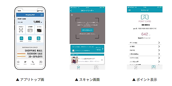 このアプリは顧客の購買データが分析・把握でき、自社の会員管理とマーケティングがアプリ1つで実現する。会員ランクに応じた優待特典の付与が可能で、商品購入時に独自ポイントを付けることでアプリ会員の商業施設内の買い回りを促す。決済では、非接触のクレジット決済、決済と連動したクーポンの利用が可能。顧客はスマートフォンだけでスムーズに買い物できる。