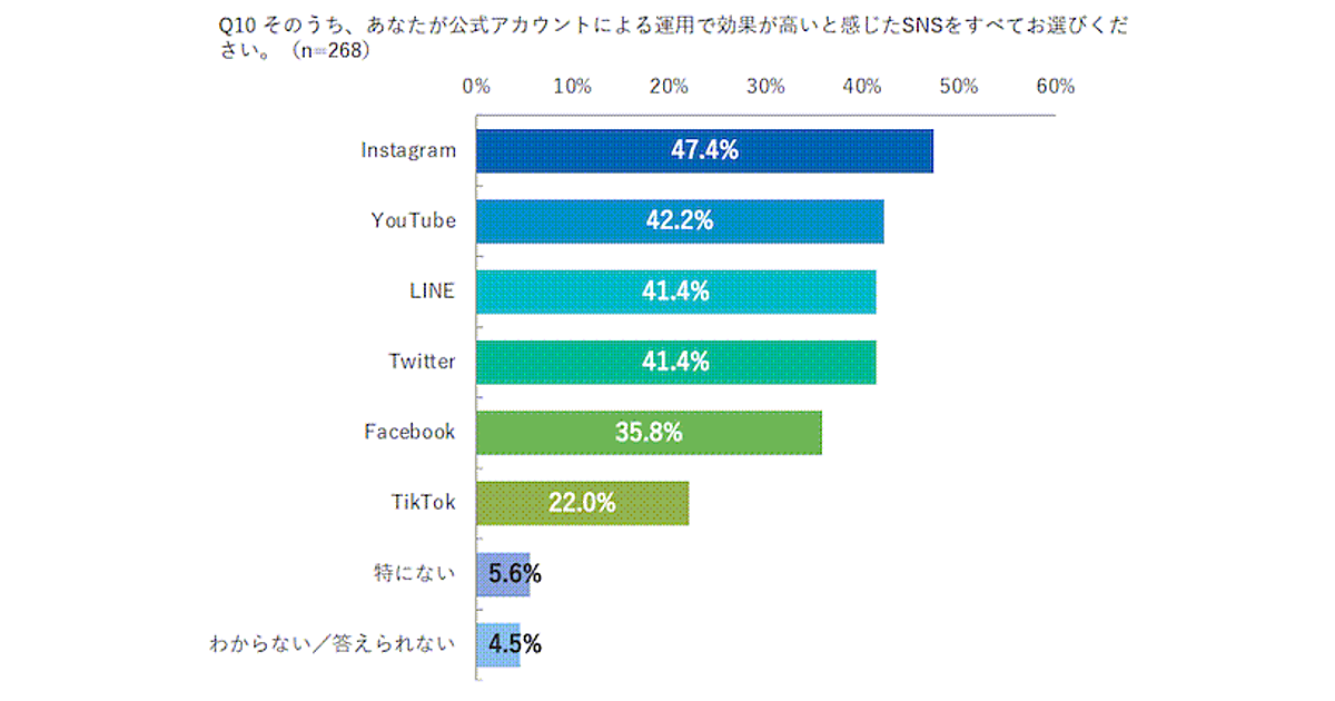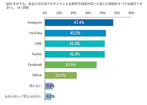 さらに、「公式アカウント運用による効果が高いと感じるSNS」を聞くと順位が変わり、こちらは「Instagram」47.4%が1位となった。