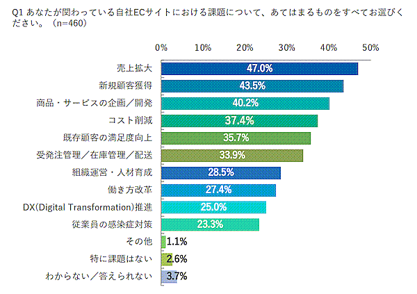 自社ECサイトの課題は「売上拡大」「新規顧客獲得」「商品・サービスの企画/開発」