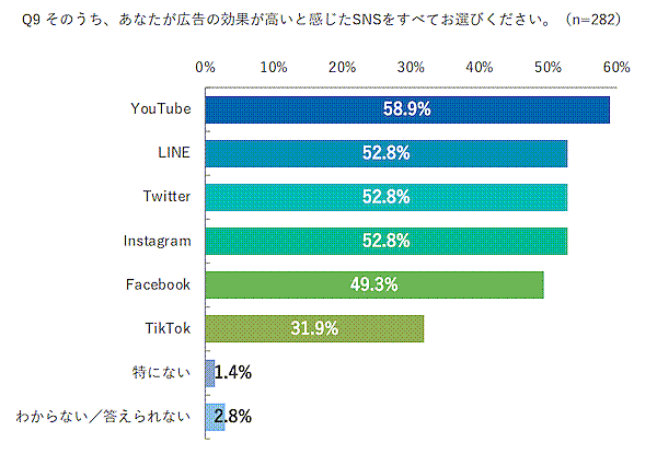 SNSの活用については、LINE、Twitter、Facebook、Instagram、YouTubeを利用している企業はそれぞれ6割超。TikTokも4割近くが利用する。一方で「広告効果が高いと感じるSNS」では、「YouTube」58.9%がもっとも高かった。動画広告の訴求力が強いだけでなく、コロナ禍で動画視聴時間が増加していることも影響している可能性が高い。