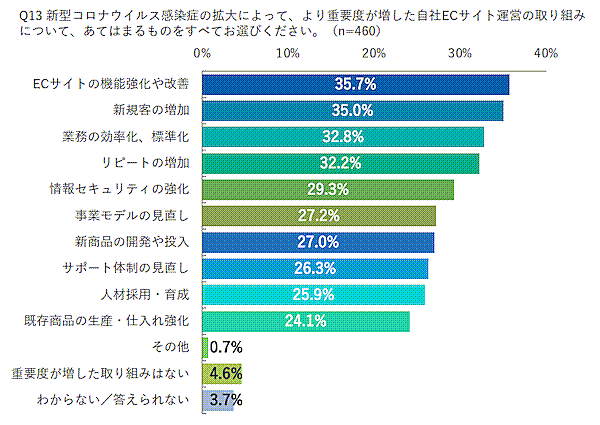 なお「新型コロナ感染拡大により、ECサイト運営で重要度が増した取り組み」を聞くと、「ECサイトの機能強化や改善」35.7%、「新規客の増加」35.0%、「業務の効率化、標準化」32.8%が上位となった。こちらも多面的な対応が求められているようだ。