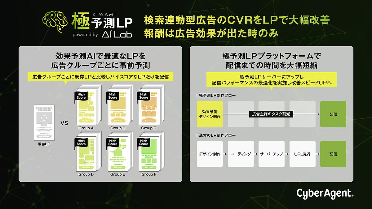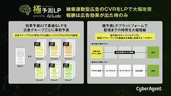 インターネット広告事業のサイバーエージェントは、検索連動型広告のCVR(コンバージョンレート)=顧客転換率=を改善する仕組み「極予測LP(キワミヨソクエルピー)」の提供を始める、と6月23日発表した。同社の「効果予測AI(人工知能)」を活用し、配信前に広告効果予測値が高いランディングページを制作。効果があった場合のみ制作費を成功報酬にする。