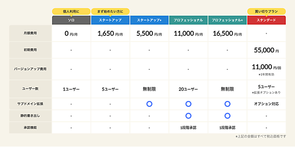 a-blog cmsをプライベートで自由に使用してもらうため、ソロライセンスを導入した。個人で運営している趣味のウェブサイト、ブログなどの制作に活用できる。アフィリエイトの利用も可能。月額費用、バージョンアップ費用ともかからない。1ユーザー(管理者・編集者・投稿者)までで、ユーザー数追加などのオプションは追加できない。