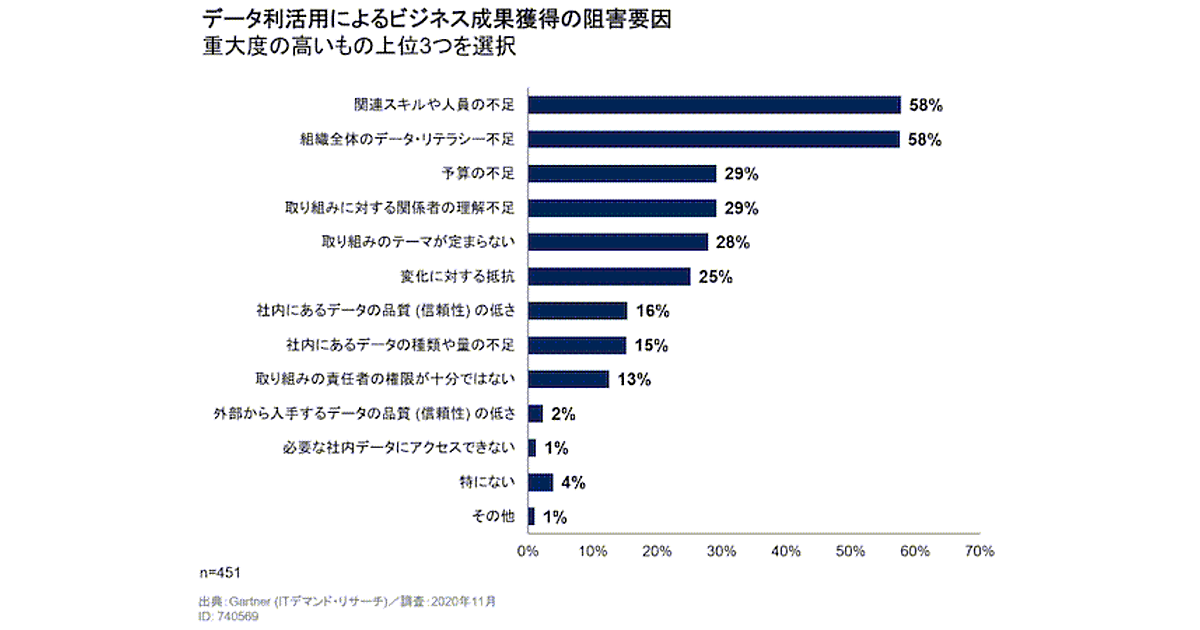 一方「ビジネス成果獲得を阻害した要因や取り組み」を聞くと、こちらは「関連スキルや人員の不足」「組織全体のデータ・リテラシーの不足」が同率58%で上位となった。