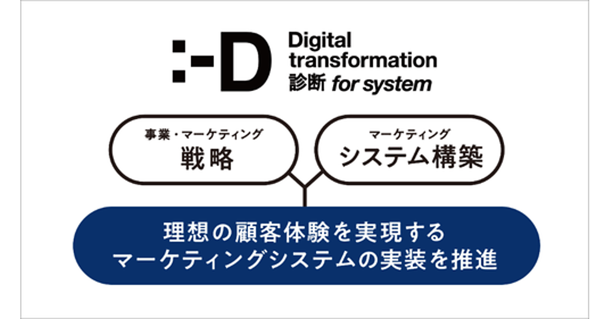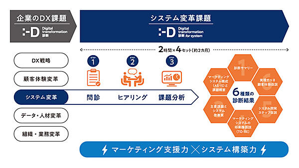 DX診断 for システムは、マーケティング戦略とシステムの両面から課題を明らかにし、統合的で実効性があるソリューションで理想の顧客体験を可能にするマーケティングシステムを提示。システム構築に必要な要素を網羅した6種類の診断結果を基に、プロジェクトの計画や要件定義にスムーズに移行できる。2時間×4セットの短期完結型有償サービスとなる。期間は2カ月程度。