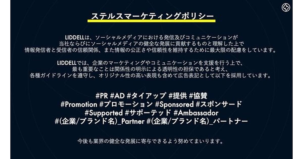 広告表記としては、独自性の高い表現を含めて「#PR #AD #タイアップ #提供 #協賛 #Promotion #プロモーション #Sponsored #スポンサード #Supported #サポーテッド #Ambassador #(企業/ブランド名)_Partner #(企業/ブランド名)_パートナー」を採用する。LIDDELLは、2017年からステマ撲滅に向けたさまざまな啓発活動を実施している。