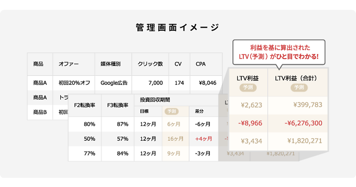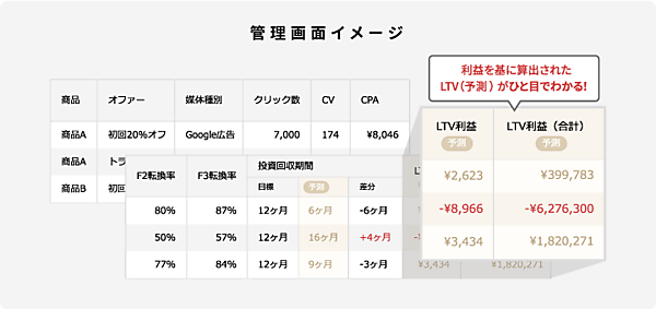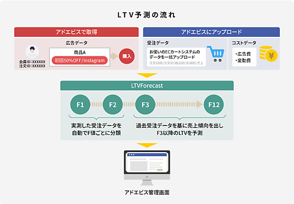 アドエビスで計測するWeb広告データと、D2C事業者が使うECカートシステムが保有する受注データ、広告費や原価など変動費を含むコストデータをアドエビスにアップロードしてWeb広告施策のLTVを予測する。従来1年以上の期間が必要だったが最短1カ月で実施でき、迅速に広告投資判断できる。「商品」と「オファー」「媒体」を掛け合わせた細かな粒度のデータ計測・LTV予測のほか、転換率やROI(投資収益率)で施策を評価できる。
